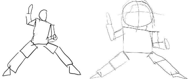 Step 1: Basic Sketching: We started by finding a reference image and tracking out the shapes and proportions of the body in the selected pose, then exaggerated the proportions to make the character more cartoonish.