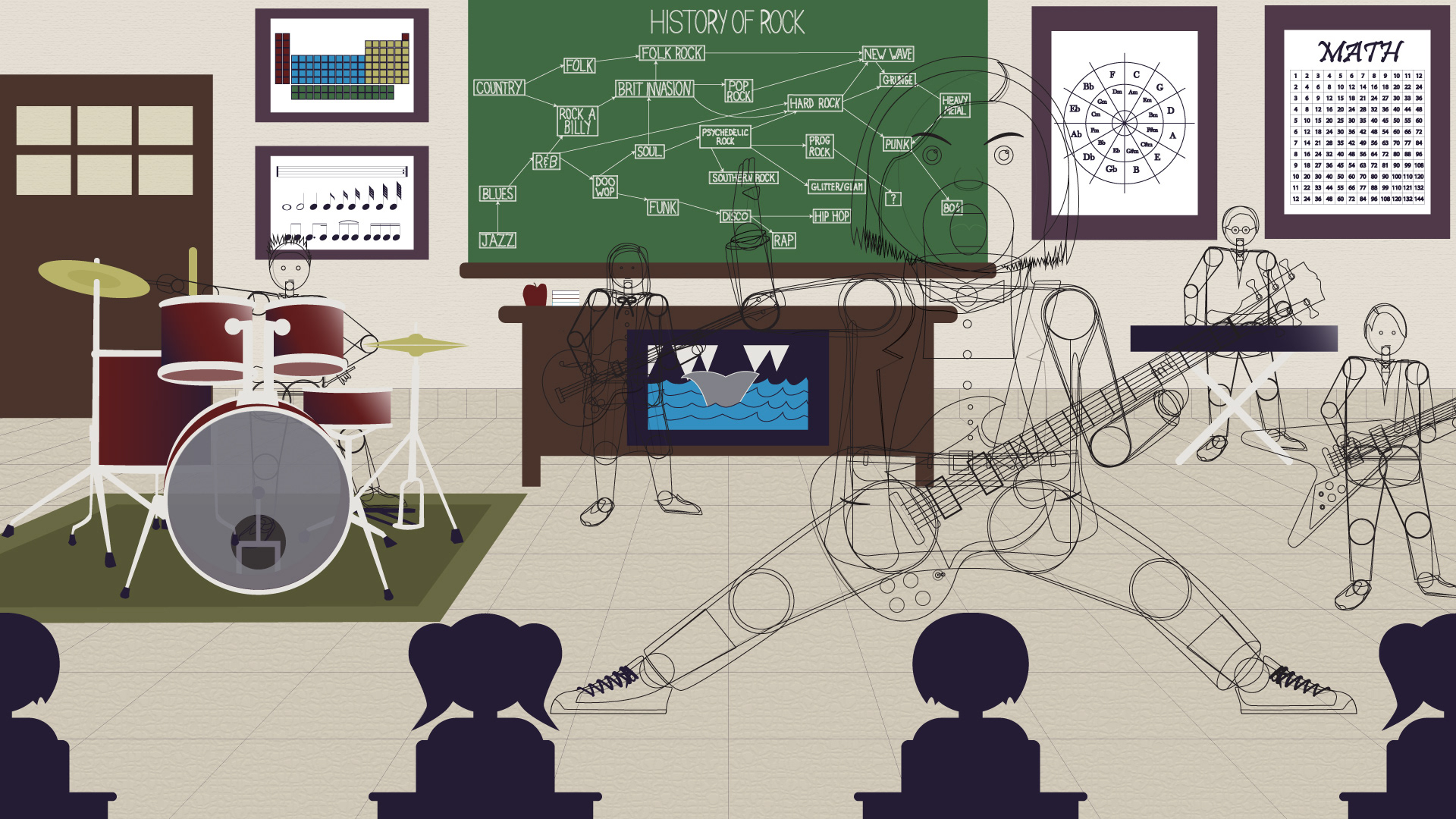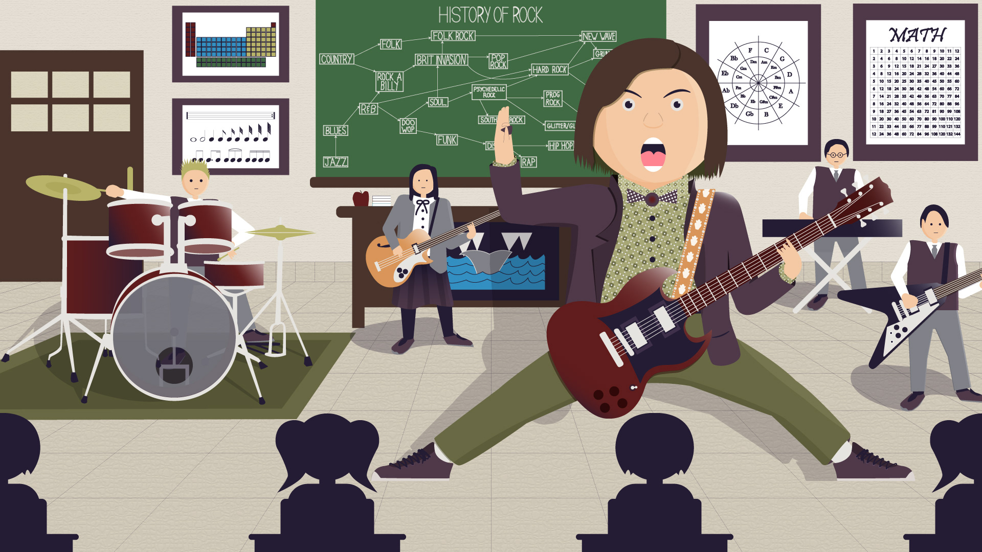 Step 5: Background Design - A classroom was designed to place Dewey in, incorporating various elements from the movie, such as the "History of Rock" chalkboard, and items regularly found in elementary school classrooms.
