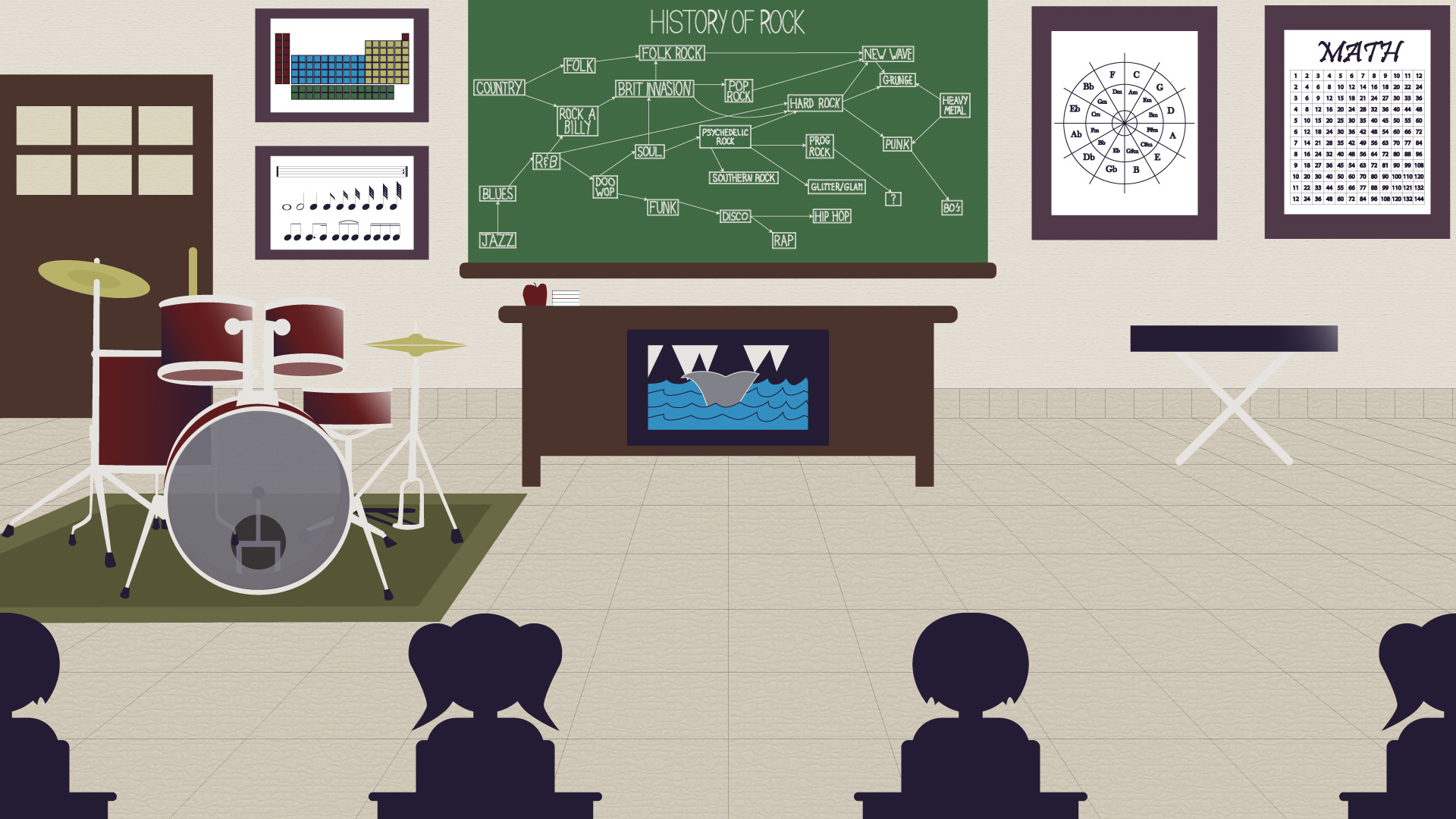 Step 6: Final character placement within the background - The classroom felt empty and uneven, even after moving the desk and drum set to various points in the room, so I ended up designing the kids to put in the background as well. All 5 characters are built with hinges for the possibility of later animation.